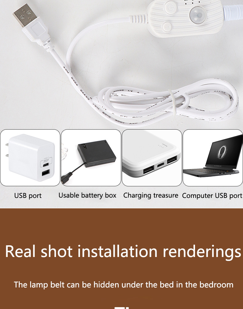 Product information: Power: 5V10W Number of LED lamp beads: 120D Control type: Human body induction Power factor: 10W Color temperature: warm white USB-human body sensing model-2m Input voltage: 5 Special service: wardrobe and Cabinet, wine cabinet, bed bottom intelligent induction Size: 612-2m LED lamp bead model: 3528 Protection level: Waterproof